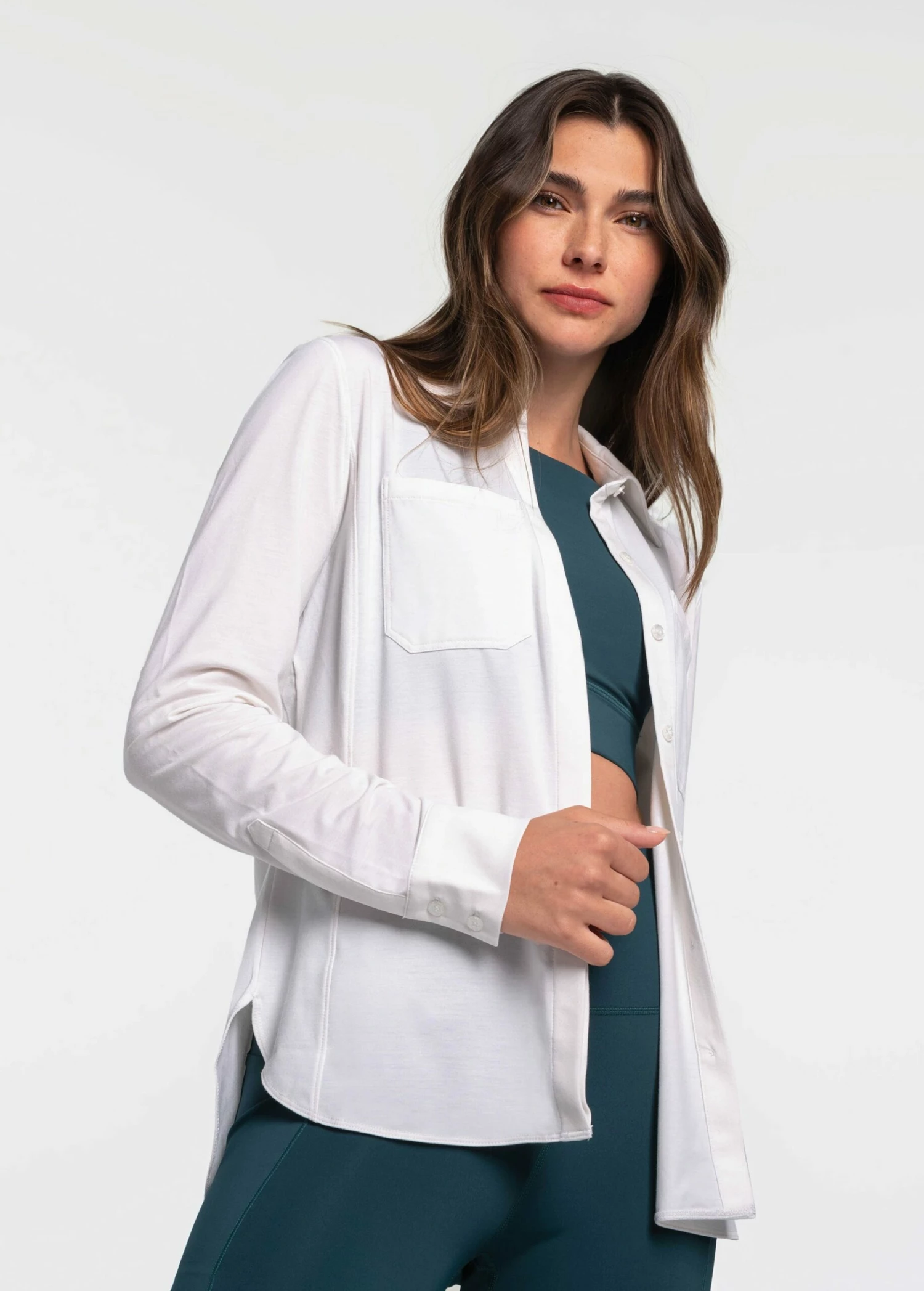 The Everyday shirt, is far from the regular fit. The long sleeve moisture-wicking, breathable, lightweight button down is hidden by a centralized frontal placket. Layer this shirt over your favorite sports bra, or tank for the perfect athleisure look. Featuring button closure cuffs and chest pockets crafted a cool handfeel.